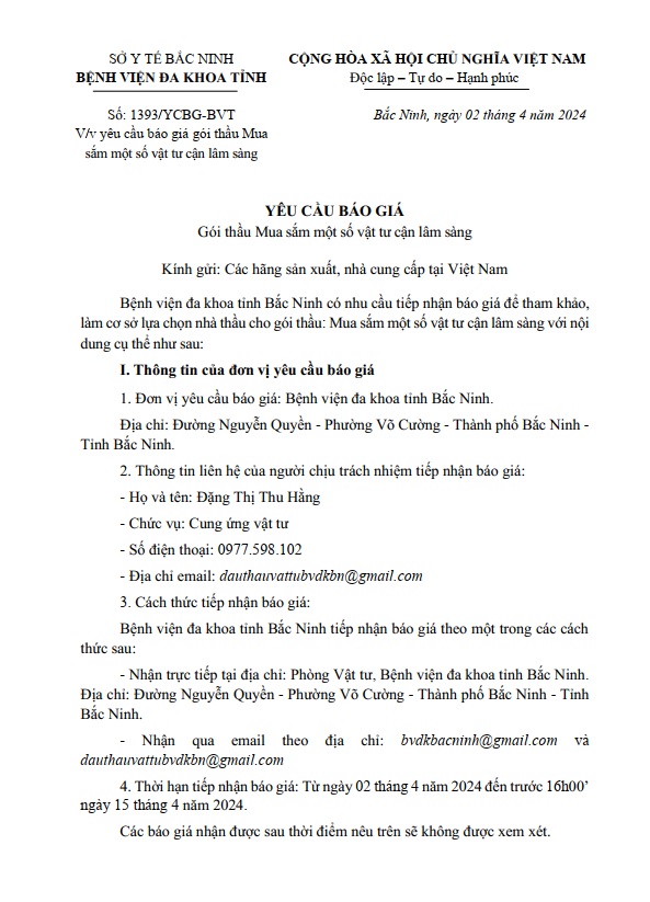Yêu cầu báo giá Gói thầu Mua sắm một số vật tư cận lâm sàng