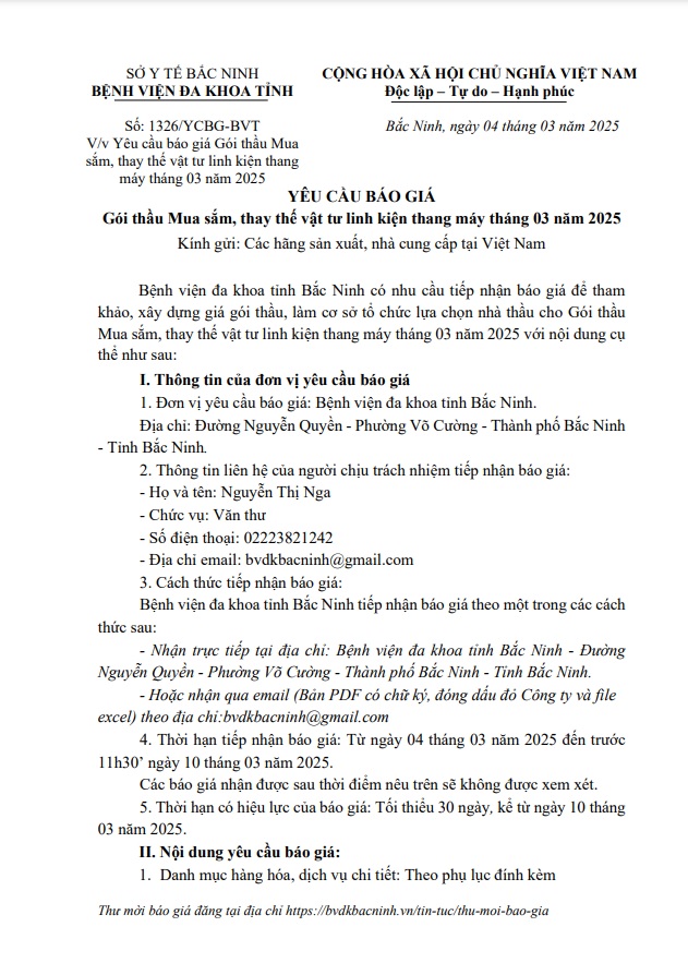 Yêu cầu báo giá Gói thầu Mua sắm, thay thế vật tư linh kiện thang máy tháng 03 năm 2025