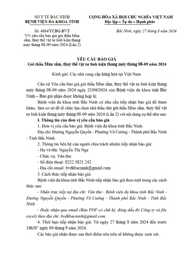 Yêu cầu báo giá gói thầu mua sắm, thay thế vật tư linh kiện thang máy tháng 08-09 năm 2024