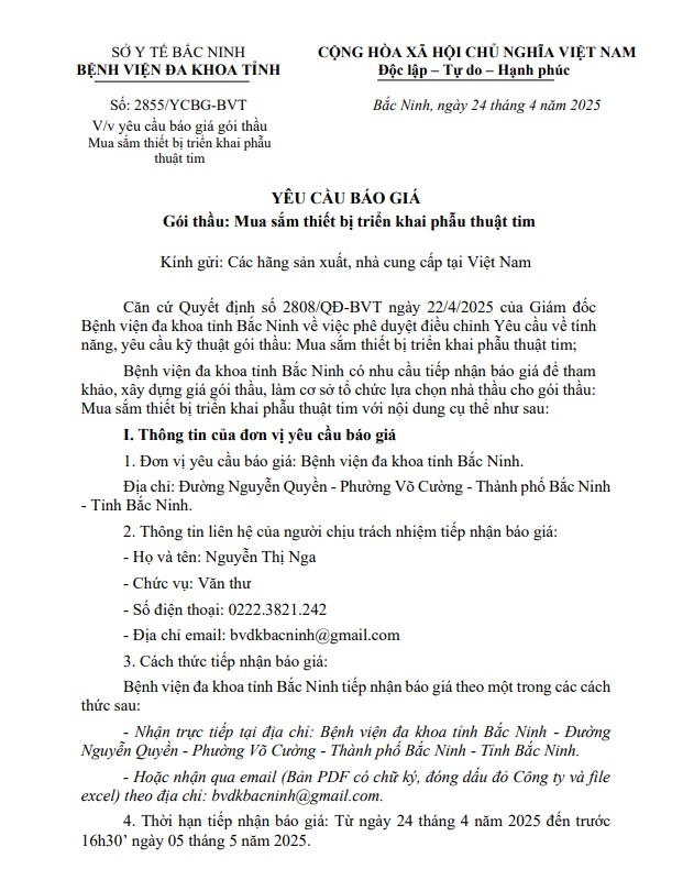 Yêu cầu báo giá gói thầu Mua sắm thiết bị triển khai phẫu thuật tim