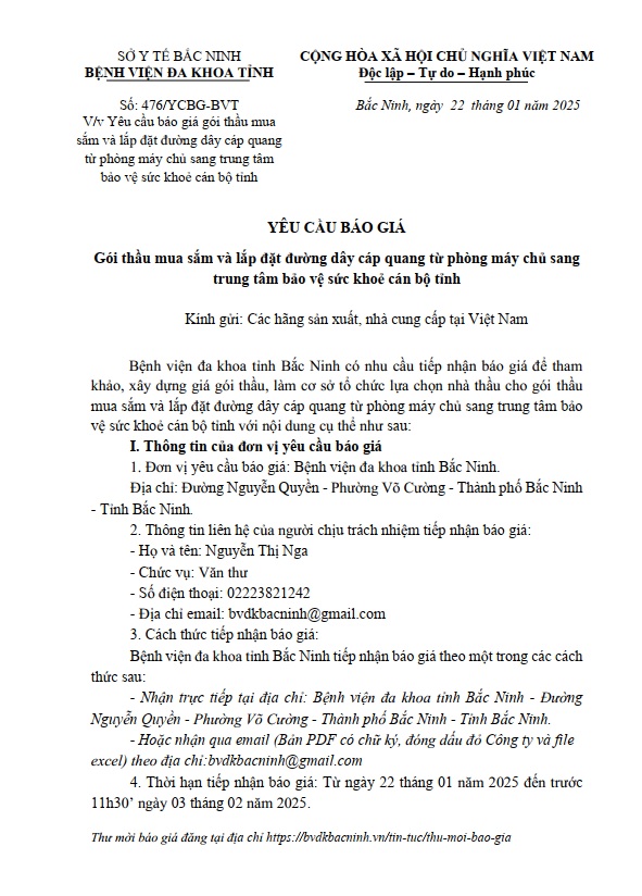 Yêu cầu báo giá gói thầu mua sắm và lắp đặt đường dây cáp quang từ phòng máy chủ sang trung tâm bảo vệ sức khoẻ cán bộ tỉnh