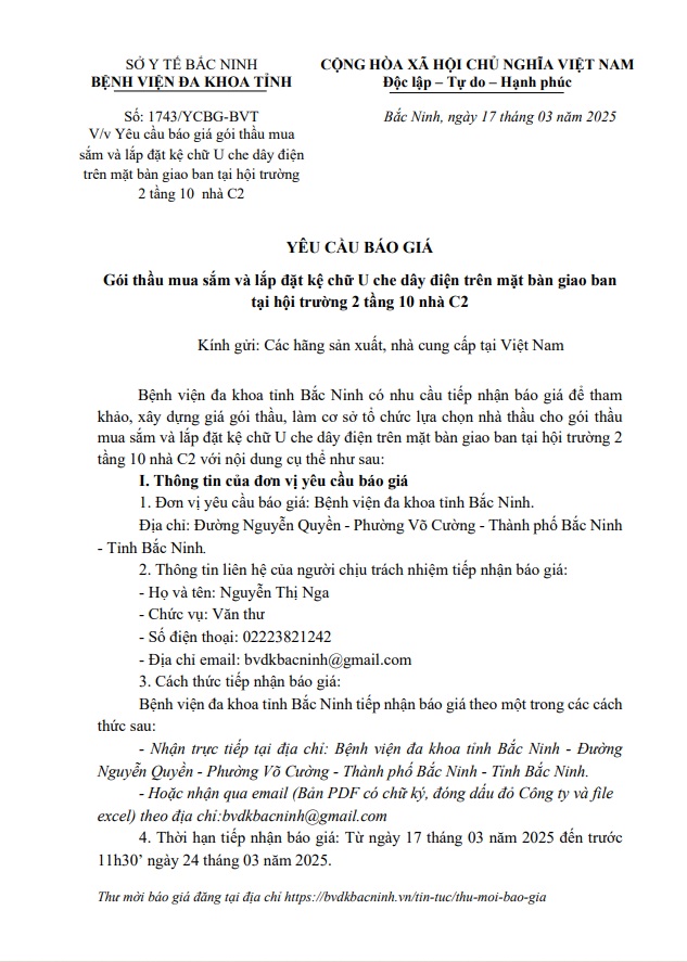 Yêu cầu báo giá gói thầu mua sắm và lắp đặt kệ chữ U che dây điện trên mặt bàn giao ban tại hội trường 2 tầng 10 nhà C2