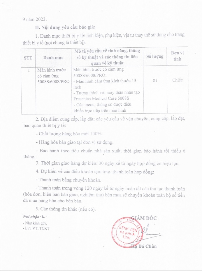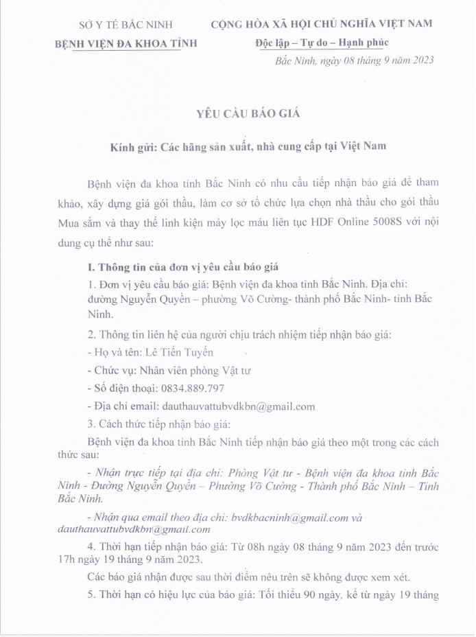 Yêu cầu báo giá gói thầu Mua sắm và thay thế linh kiện máy lọc máu liên tục HDF Online 5008S