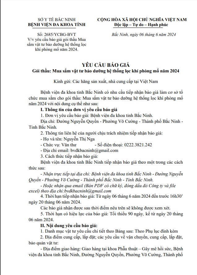 Yêu cầu báo giá gói thầu mua sắm vật tư bảo dưỡng hệ thống lọc khí phòng mổ năm 2024