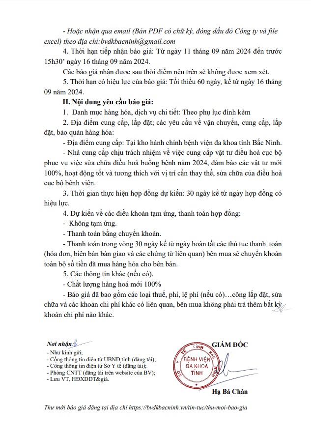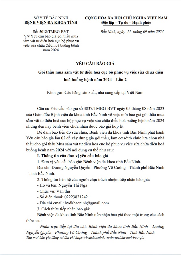 Yêu cầu báo giá Gói thầu mua sắm vật tư điều hoà cục bộ phục vụ việc sửa chữa điều hoà buồng bệnh năm 2024 - Lần 2