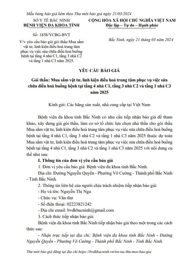 Yêu cầu báo giá gói thầu Mua sắm vật tư, linh kiện điều hoà trung tâm phục vụ việc sửa chữa điều hoà buồng bệnh tại tầng 4 nhà C1, tầng 3 nhà C2 và tầng 1 nhà C3 năm 2025.