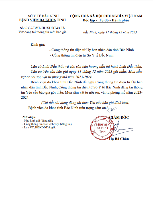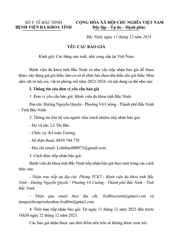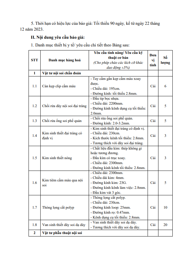 Yêu cầu báo giá gói thầu: Mua sắm vật tư nội soi, vật tư phòng mổ năm 2023- 2024