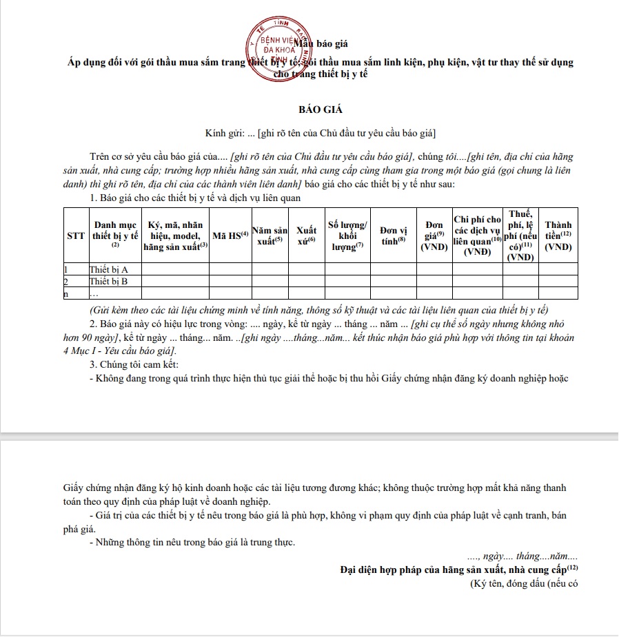 Yêu cầu báo giá gói thầu Mua sắm một số vật tư dùng cho cấp cứu