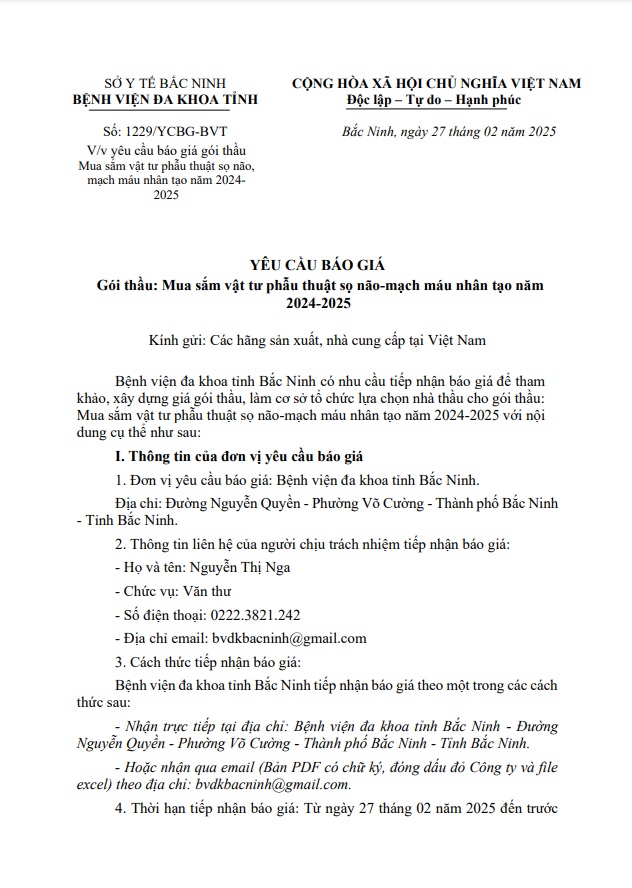 Yêu cầu báo giá gói thầu Mua sắm vật tư phẫu thuật sọ não, mạch máu nhân tạo năm 2024-2025