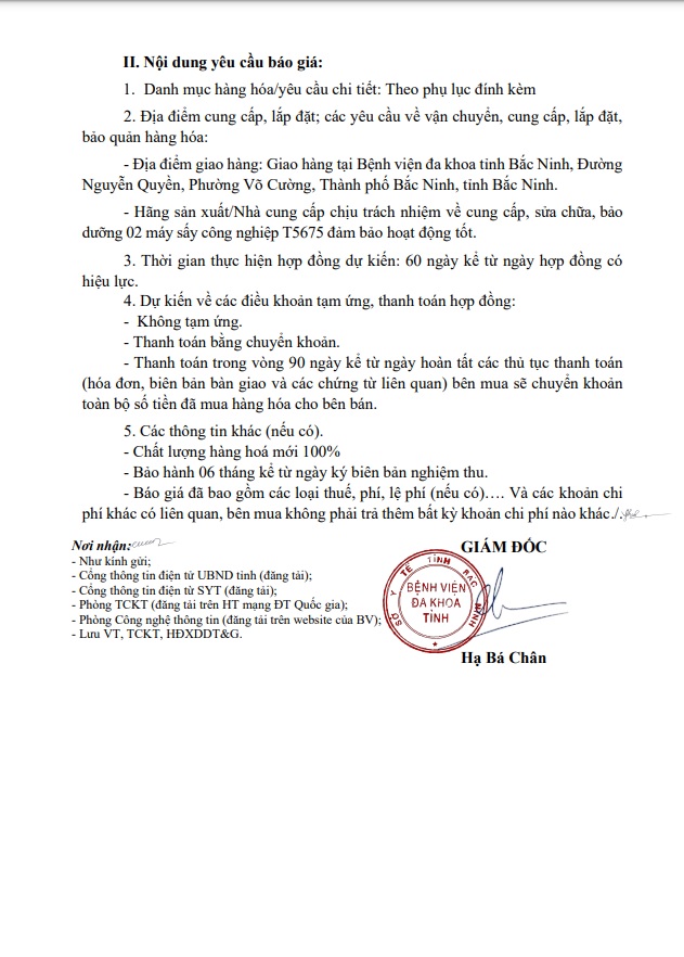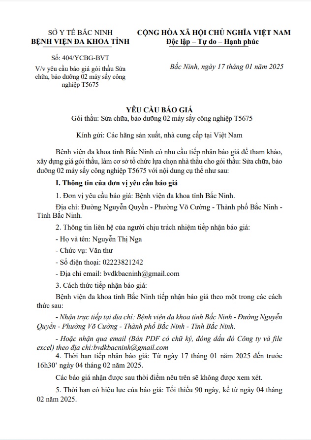 Yêu cầu báo giá gói thầu Sửa chữa, bảo dưỡng 02 máy sấy công nghiệp T5675
