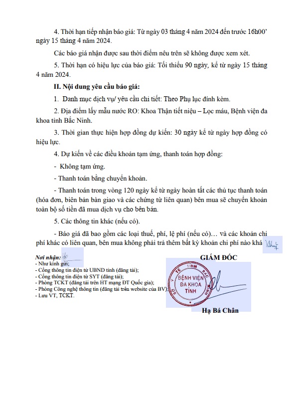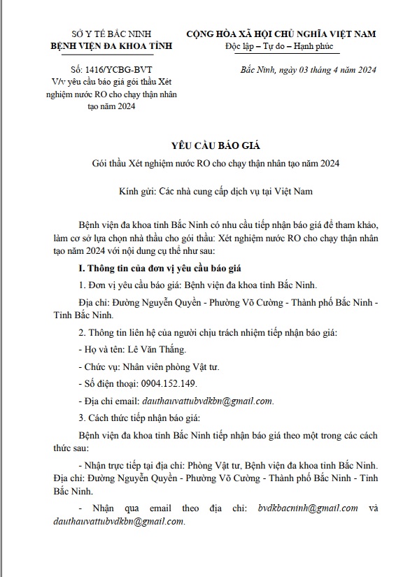 Yêu cầu báo giá Gói thầu Xét nghiệm nước RO cho chạy thận nhân tạo năm 2024