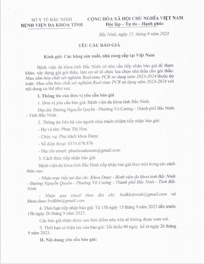 Yêu cầu báo giá Mua sắm hoà chất xét nghiệm Real-time PCR sử dụng năm 2023-2024