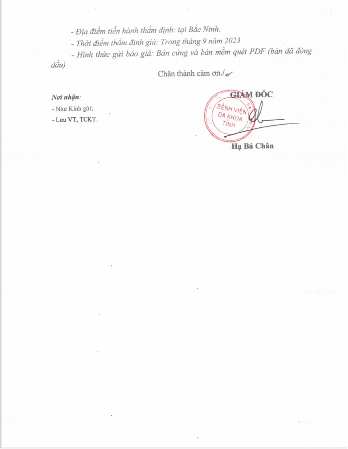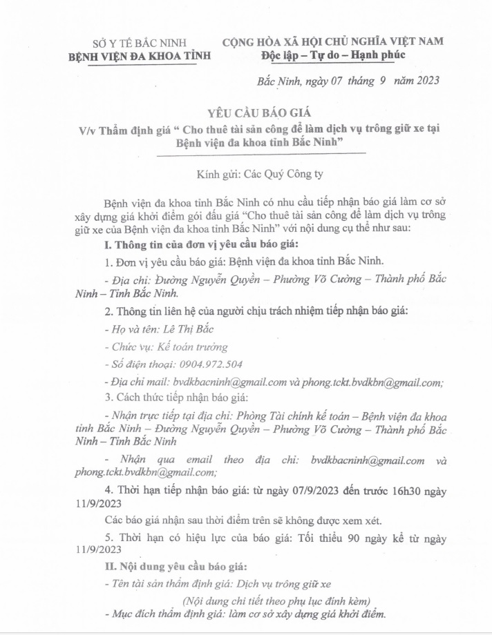Yêu cầu báo giá V/v Thẩm định giá " Cho thuê tài sản công để làm dịch vụ trông giữ xe tại Bệnh viện đa khoa tỉnh Bắc Ninh"