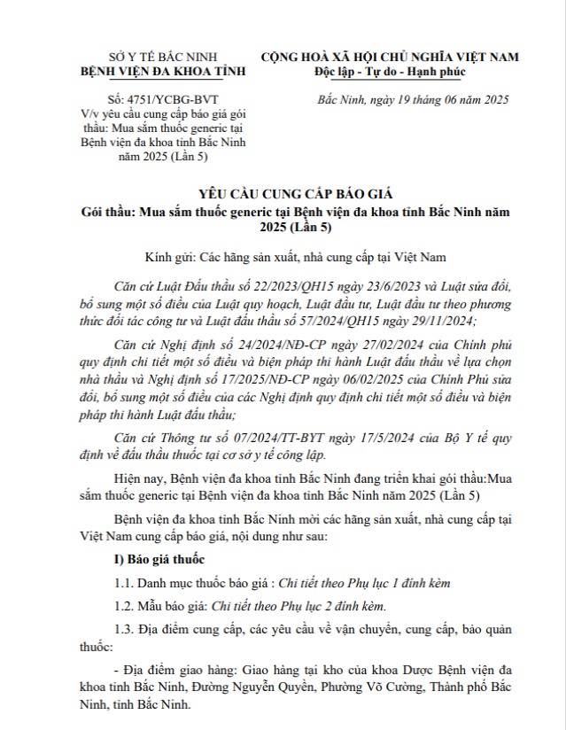 Yêu cầu cung cấp báo giá gói thầu: Mua sắm thuốc generic tại Bệnh viện đa khoa tỉnh Bắc Ninh năm 2025 (Lần 5)