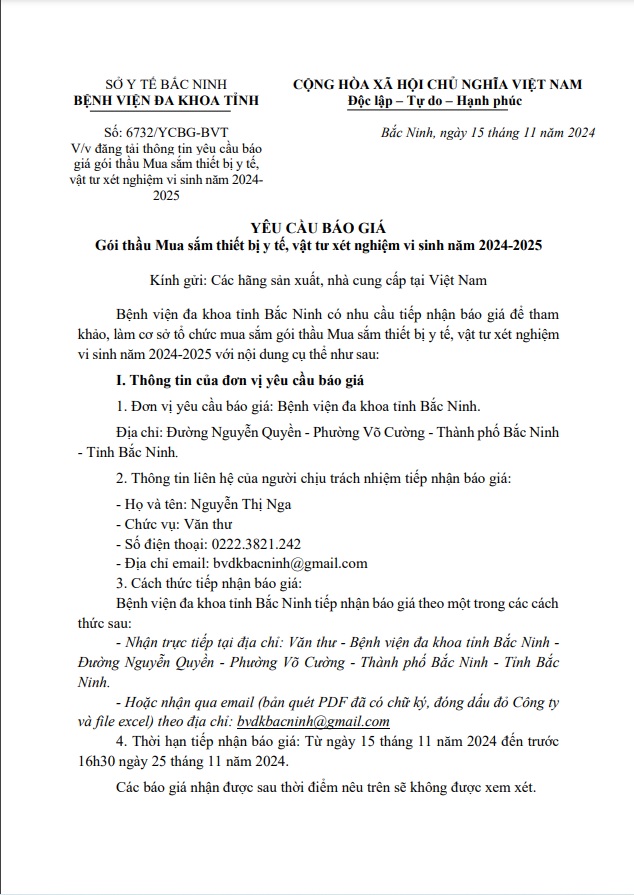 Yêu cầu báo giá Gói thầu Mua sắm thiết bị y tế, vật tư xét nghiệm vi sinh năm 2024-2025